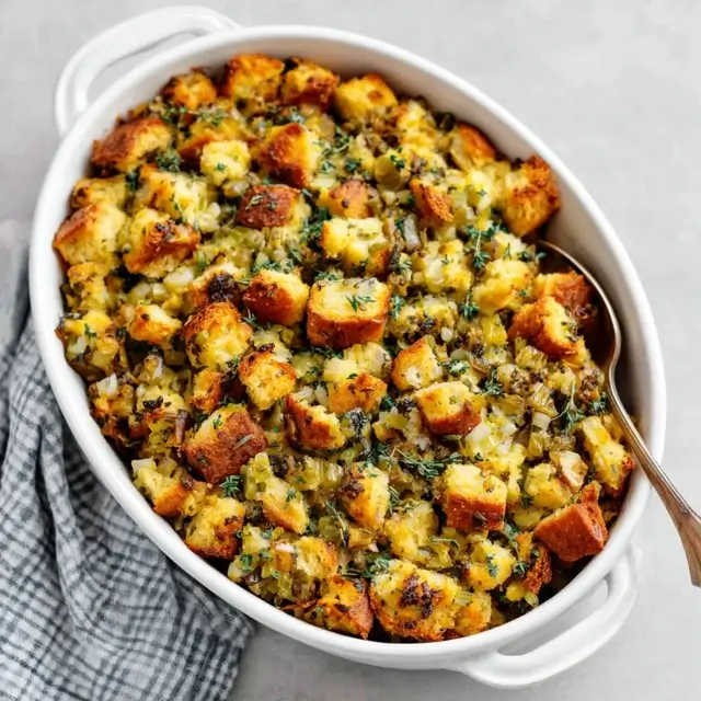 A flavorful Thanksgiving stuffing, seasoned with herbs and spices, is featured in this holiday dish image.