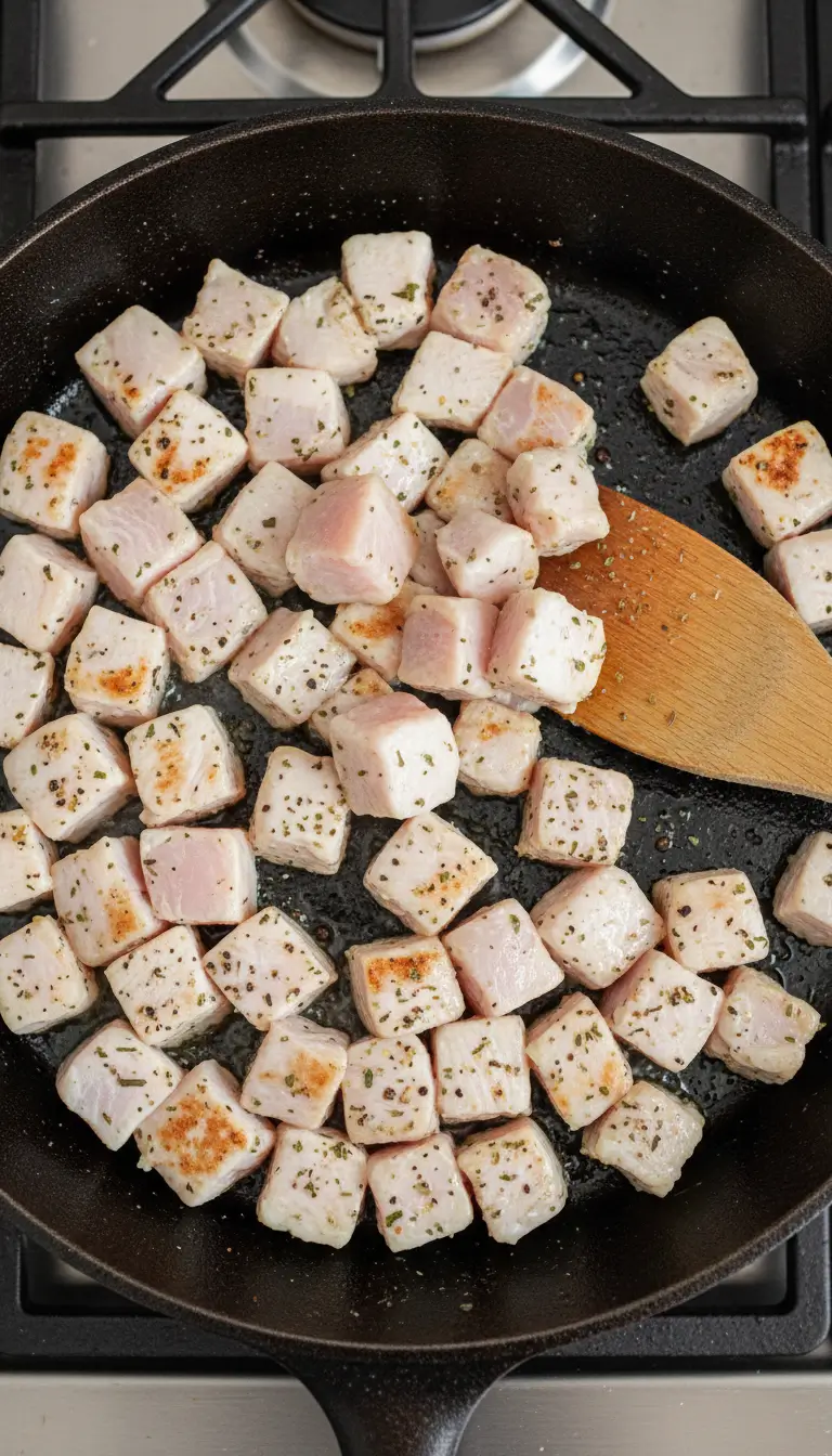 - Season cubed chicken breast with Italian seasoning, salt, and pepper. Heat 1 tablespoon olive oil in a skillet over medium-high heat. Cook chicken for 5-7 minutes until cooked through and lightly browned. Transfer to a plate.