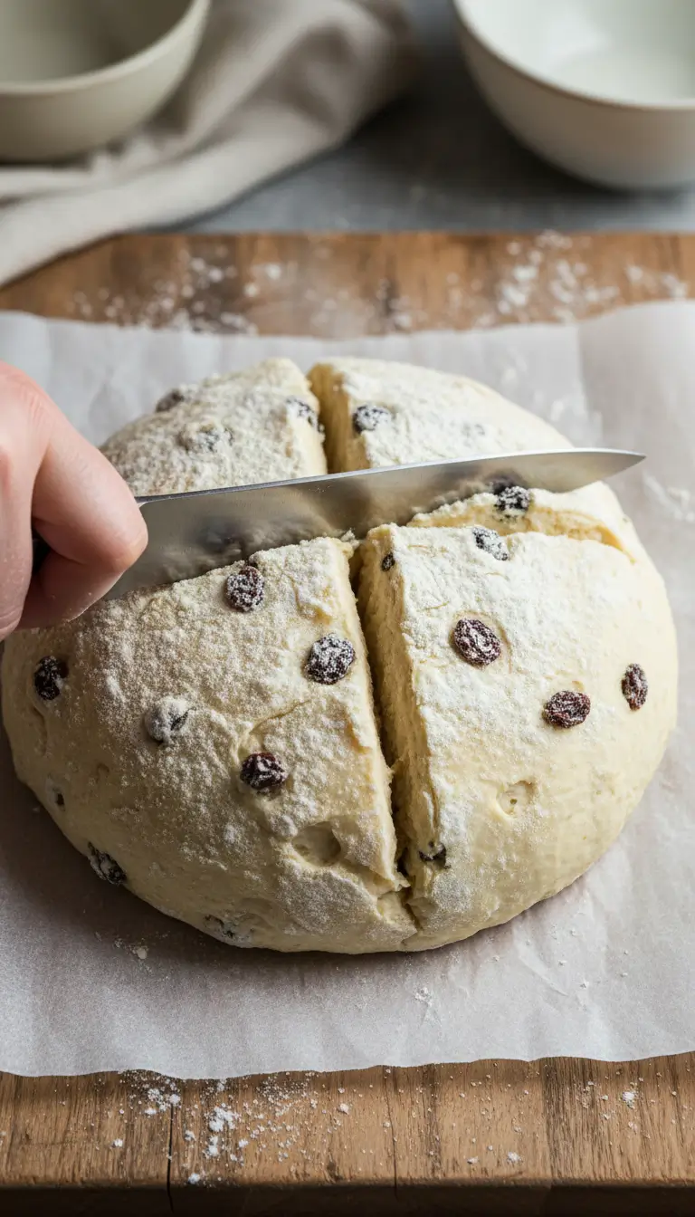 Place the ball on your prepared baking sheet. Pat it gently into a 7-inch round. Using a sharp, floured knife, cut a deep “X” into the top, going almost all the way through to the edges.