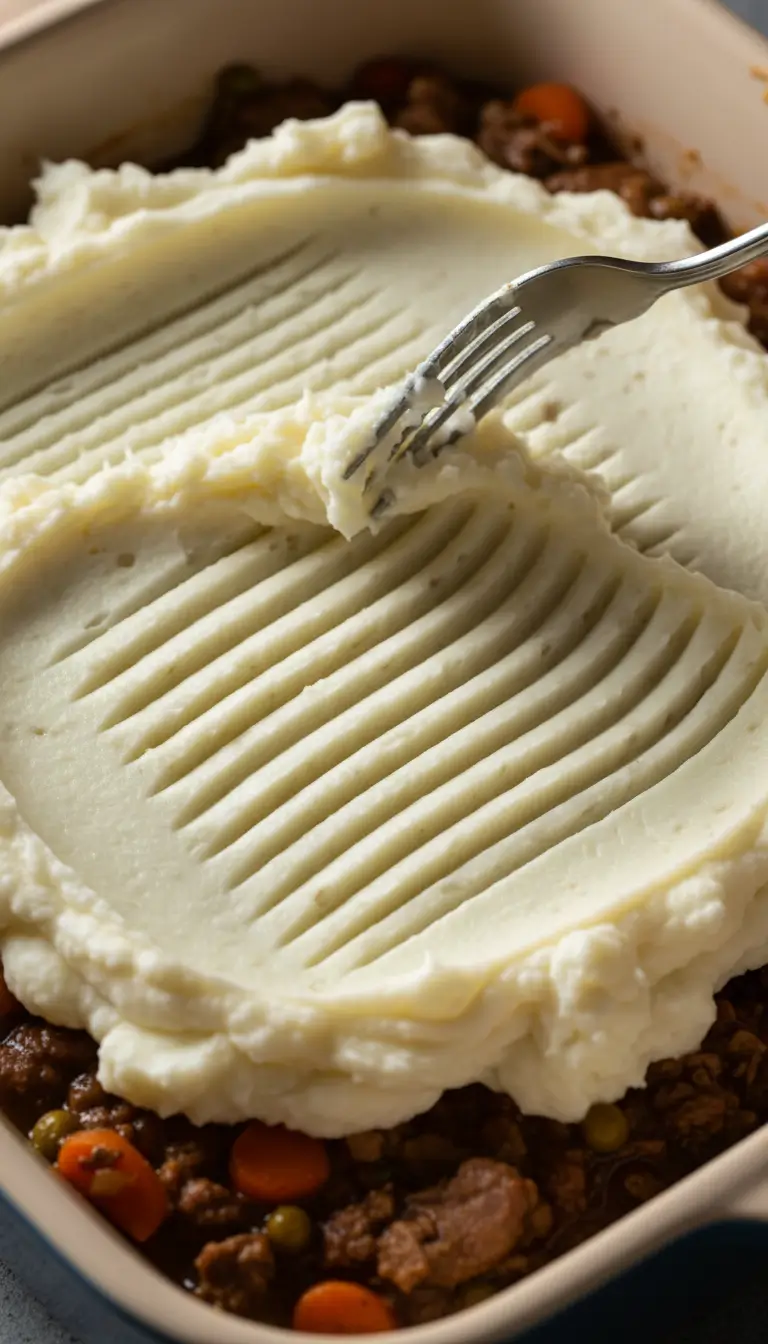 - Assemble: Transfer the warm meat filling to a 9×13 inch baking dish, spreading evenly. Dollop the mashed potatoes over the filling. Use a fork to spread them carefully to the edges to create a seal. Create decorative swirls over the entire surface with the fork.