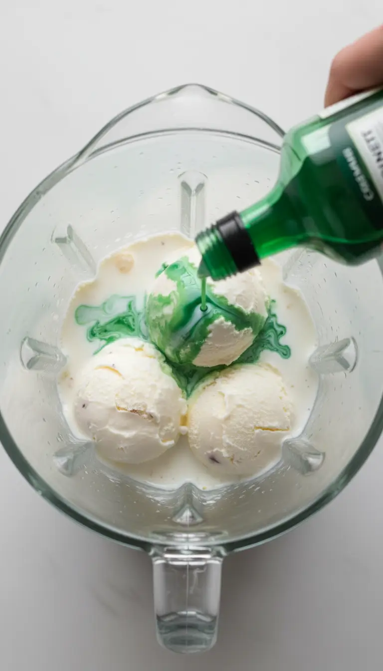 3. Combine ingredients: In a blender, add the softened ice cream, whole milk, Irish cream liqueur, creme de menthe, and pure mint extract.