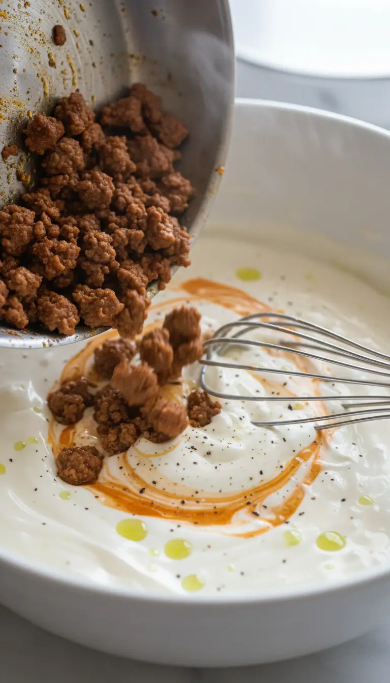 Now, here’s the pro move: scrape the seasoned beef and all those flavorful drippings from the skillet right into the creamy mixture. Whisk it all together. The warm beef will slightly temper the dressing, creating a silky, unified sauce.