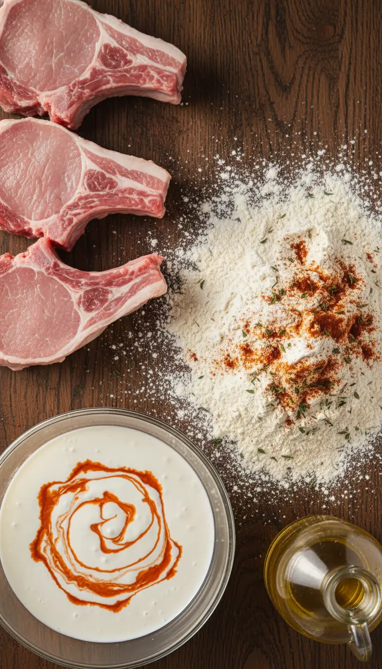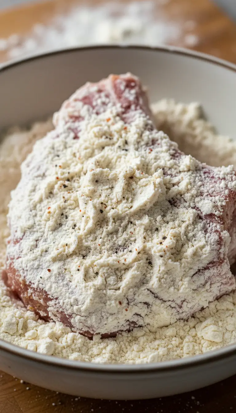 - Set up a dredging station: marinated chops, bowl of seasoned flour, and a clean wire rack.