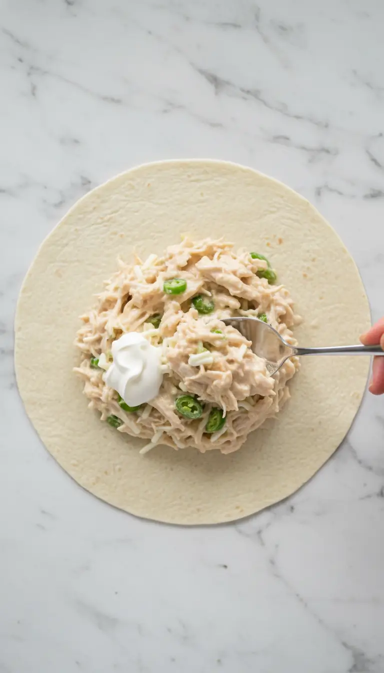 Lay a tortilla flat and spoon a generous â…“ cup of the chicken mixture down the center. Roll the tortilla up tightly around the filling.