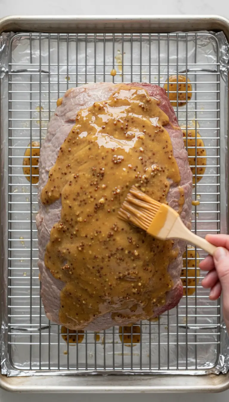 6. Using a pastry brush, generously coat the entire surface of the meat with a thick layer of the honey mustard glaze. Reserve about one-third of the glaze for a second coat.