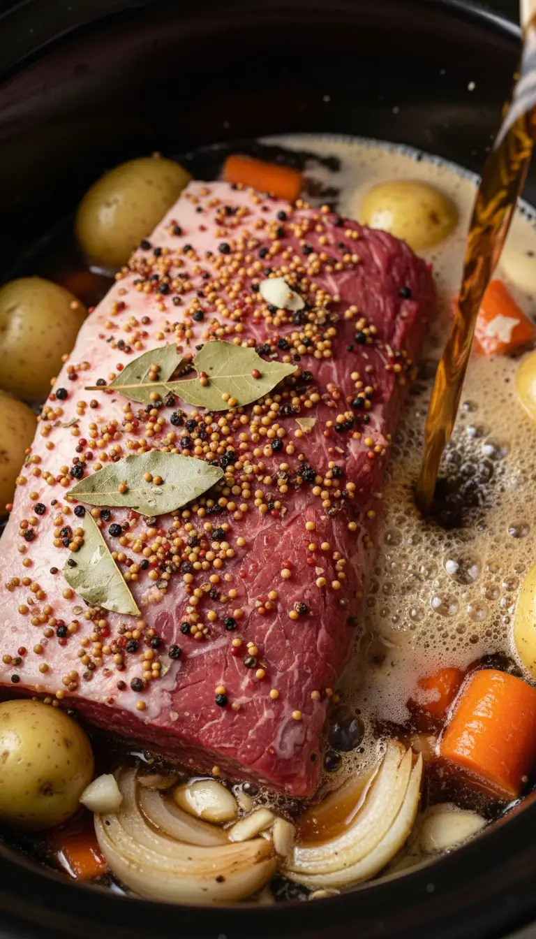 Once everything is tender, transfer the corned beef to a cutting board and let it rest for 10-15 minutes. This allows the juices to redistribute.