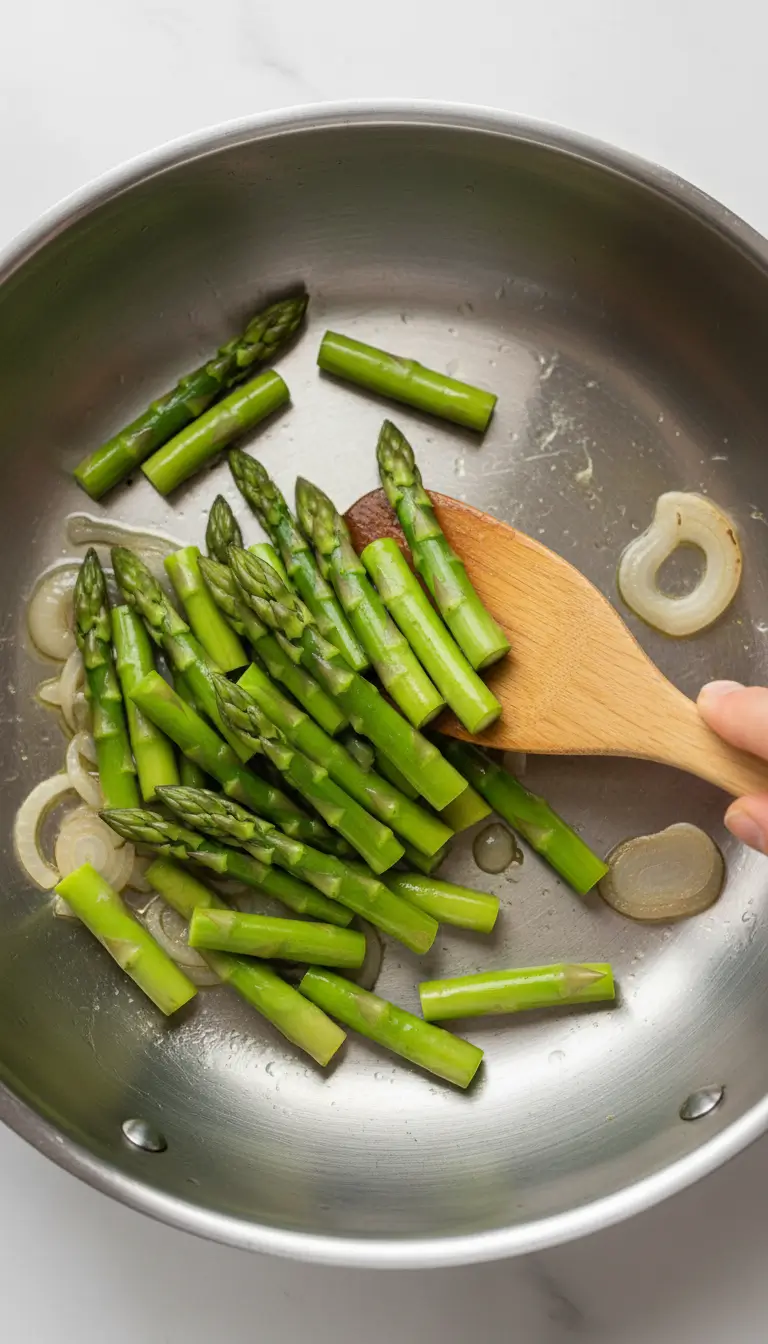 Increase the heat to medium-high. Add the asparagus pieces to the skillet. Let them cook undisturbed for a minute to get a little color, then stir and cook for another 2-3 minutes until bright green and just tender-crisp.