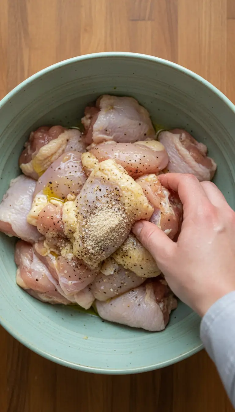 - Pat the chicken thighs completely dry on both sides with paper towels. Place in a bowl, drizzle with oil, and season with salt, pepper, and garlic powder. Toss to coat evenly.