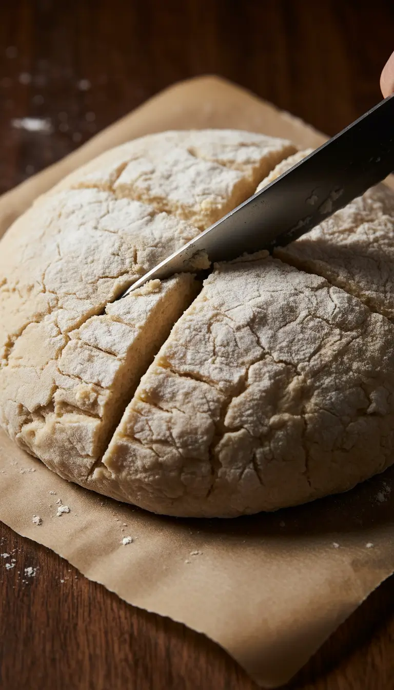 Place the dough ball onto the prepared baking sheet. Pat it gently into a round loaf, about 7 inches across. Using a sharp knife, score a deep “X” across the top, going nearly halfway through the loaf. This helps it bake evenly. Bake for 35-45 minutes.