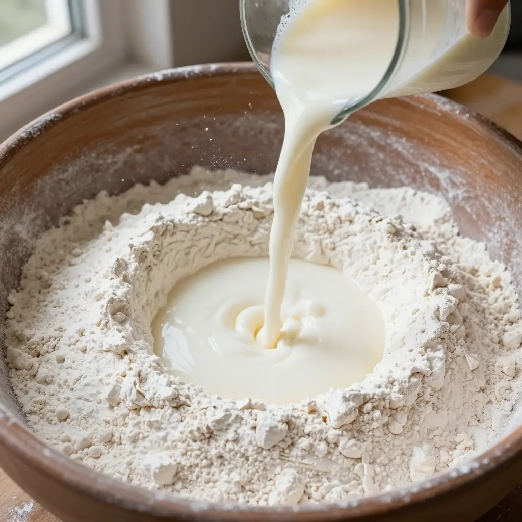 - Make a well in the center of the dry ingredients. Pour in most of the buttermilk, starting with 350ml.