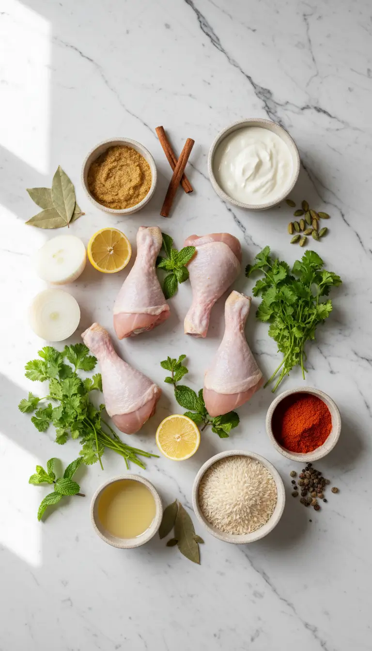 1. Marinate the chicken: In a large bowl, combine yogurt, ginger-garlic paste, turmeric, chili powder, biryani masala, salt, lemon juice, and chopped mint and cilantro. Add chicken pieces and mix thoroughly. Cover and marinate in the refrigerator for at least 1 hour, ideally 4-6 hours or overnight.